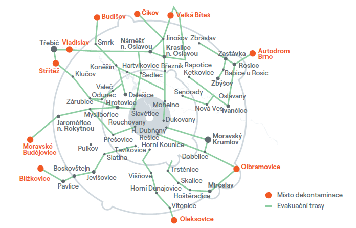 Pro evakuaci jsou voleny vhodné trasy, které vedou přes předem určená místa, kde je prováděna kontrola kontaminace, popřípadě se provádí dekontaminace. Tato místa se nazývají „místa dekontaminace“. Trasy dále pokračují přes předem stanovená přijímací/evakuační střediska. Vyjma obcí nacházejících se v ZHP Jihomoravského kraje 10-20 km pásmu v okolí JE Dukovany, viz Přehled přijímacích středisek do míst nouzového ubytování. Evakuační středisko (jen Kraj Vysočina) se určuje podle obce, z které jste evakuováni, a jsou uvedena v závěru základních informací. V evakuačním středisku vám budou poskytnuty další informace a v případě potřeby přiděleno místo nouzového ubytování.