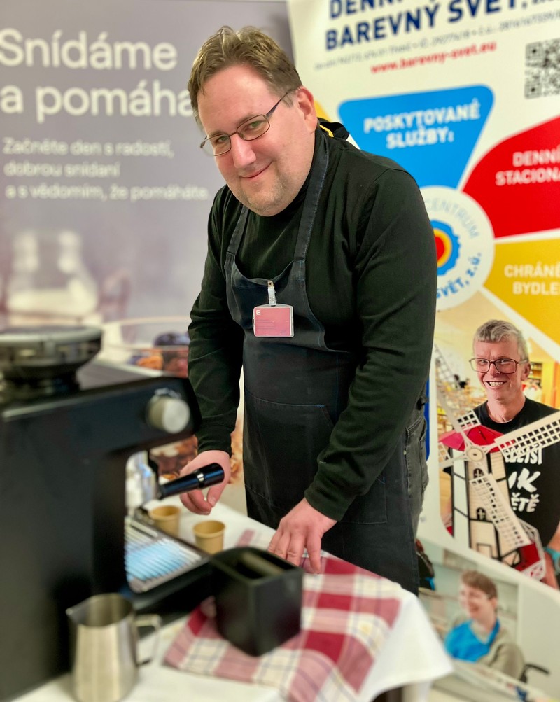 „S pákovým kávovarem jsem se naučil vařit kávu celkem rychle,“ říká Roman Švarc. „Baví mě dělat dobrou kávu a přinášet radost druhým,“ dodává Roman Švarc z Barevného světa Jaroměřice.