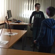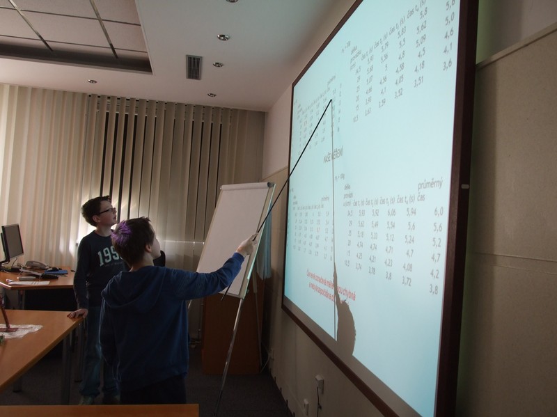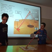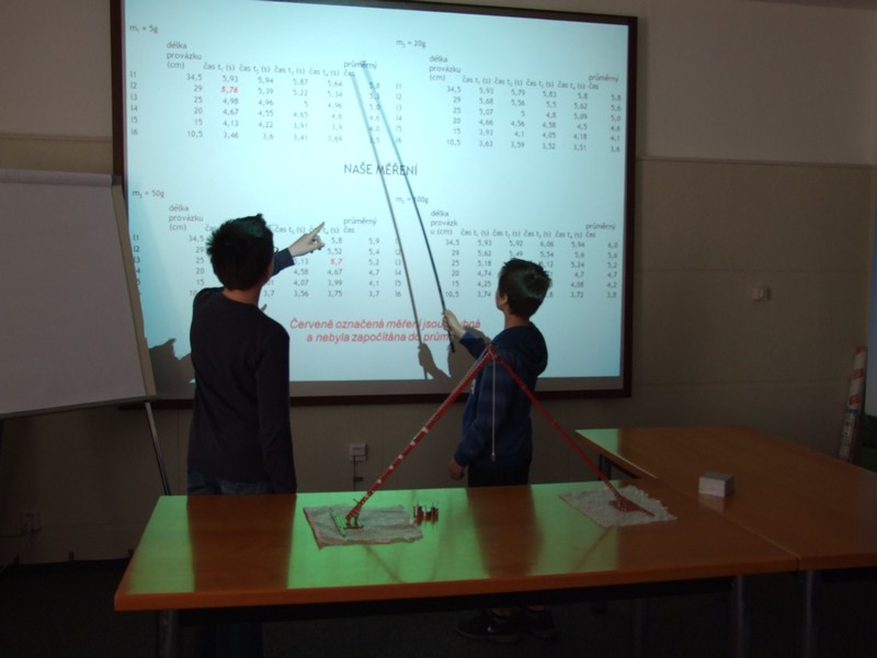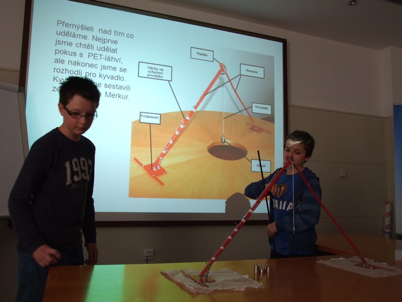 Jan Wasserbauer a Dominik Verner z Biskupského gymnázia ze Žďáru nad Sázavou si připravili pokus s kyvadlem. „Měřili jsme čas a délku provázku při různě těžkých závažích. Zjistili jsme, že čím delší je provázek, tím je delší čas kyvadla,“ shrnul Honza s Dominikem.