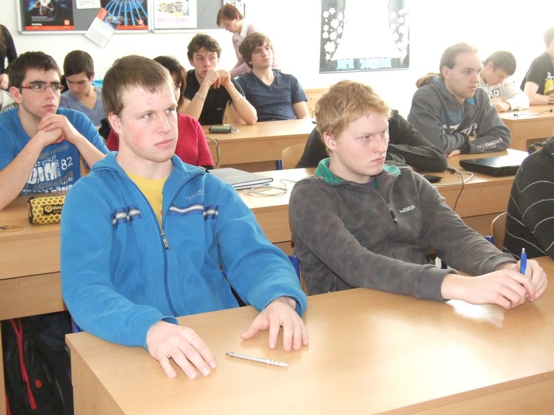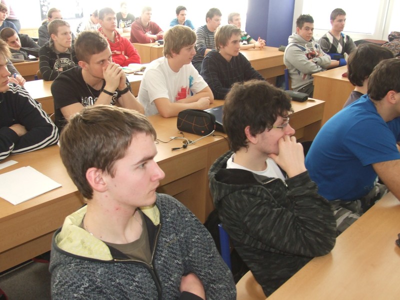 Radek Fukas z dukovanské elektrárny představil celé třídě možnosti jejich uplatnění v elektrárně. „Po nástupu do elektrárny projdete proškolením, čeká vás projití školicím střediskem v Brně se závěrečnými zkouškami. Následuje dublování, tedy zácvik se zkušeným pracovníkem, kde se přímo v praxi naučíte, co je potřeba dělat a také se naučíte místopis, co, kde v elektrárně je. Po ukončení zácviku jsou podnikové zkoušky, podle oboru vás kompletně vyzkouší směnový inženýr a vedoucí technolog,“ popsat maturantům Radek Fukas proces nástupu do práce v elektrárně. Studenti se zajímali o platové ohodnocení, podmínky přijetí a také o přesné náplně jednotlivých pozic. Petra Lázničková poté studentům představila vysoké školy, se kterými ČEZ spolupracuje, a také stipendijní program pro vysokoškoláky.