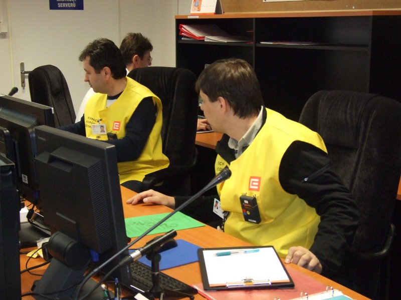 Před osmou hodinou ráno se novináři přesunuli do cvičného trenažeru blokové dozorny. Přesně v osm hodin došlo k fiktivnímu blackoutu. Celá místnost pohasla. Osvětlovaly ji blesky fotoaparátů a světlo z kamer. Zástup novinářů pod vedením tiskového mluvčího Petra Spilky se přesouvá ke vstupu do elektrárny. Každý obdrží ochrannou helmu a musí projít bezpečnostním vstupem. Kamery, fotoaparátky, nahrávadla, mikrofony a další věci procházejí skenerem. Vedle nich musí každý novinář projít vstupní kontrolní bránou. Mezitím novináři průběžně informují své redakce o průběhu cvičení, rozhlasoví novináři přímo z místa vstupují do živého vysílání.