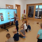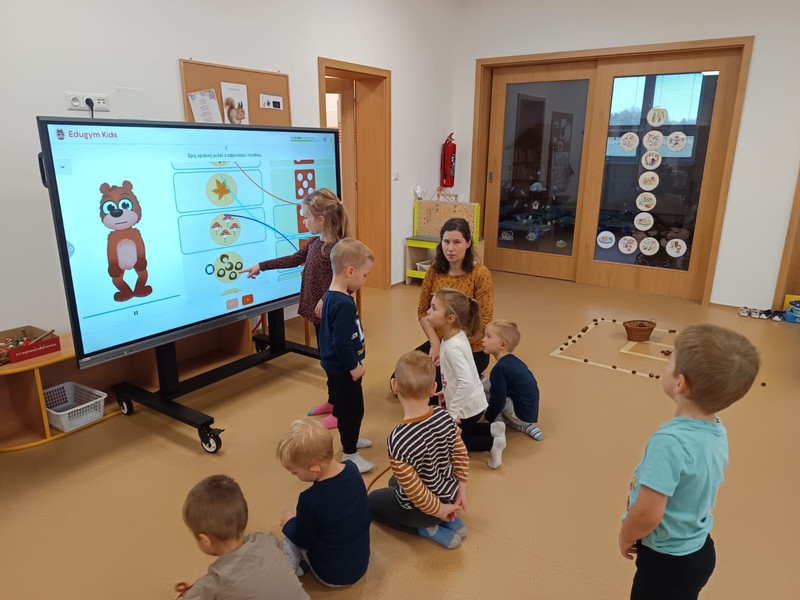 K interaktivní tabuli, která je také mobilní díky elektrickému stojanu, pořídili aplikaci vhodnou pro předškolní děti. Ta vznikla z podnětů pedagogů a obsahuje online aktivity i aktivity mimo obrazovku jako například cvičení nebo různé pokusy.